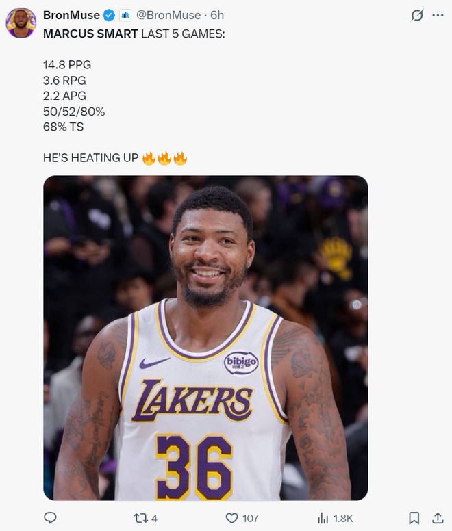 最近的五场比赛斯玛特的确成为湖人第三得分点,场均拿到14.8分3.6篮板2.2助攻,命中率50%,三分命中率52%,罚球命中率80%,真实命中率68%。