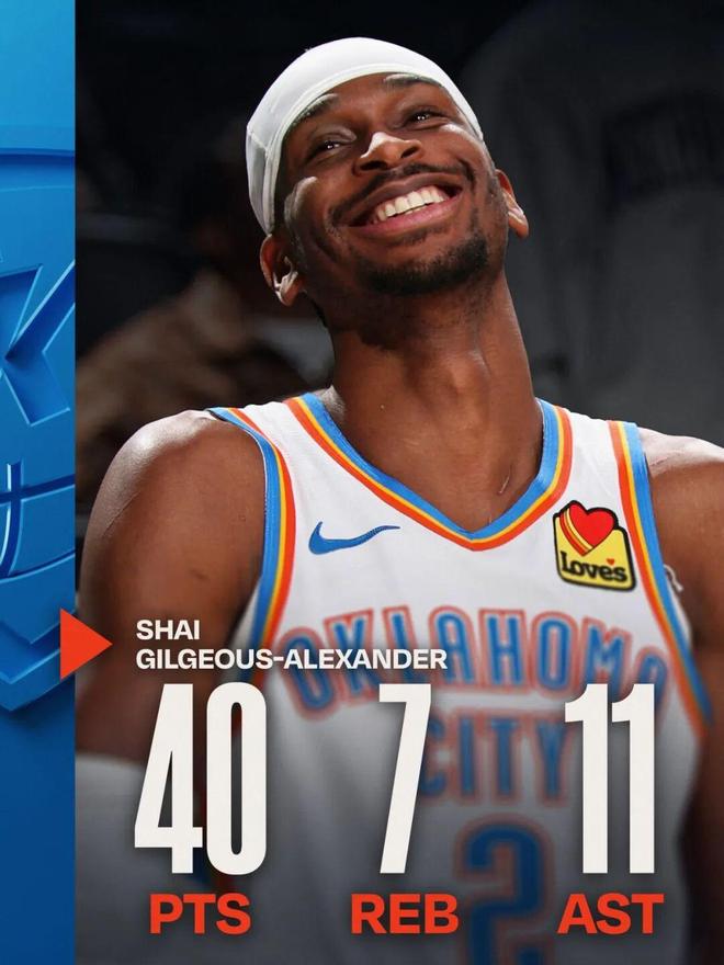 ——单场40分+10助攻+80%命中率,近50年只有两人做到,昨天的奎克利,今天的亚历山大