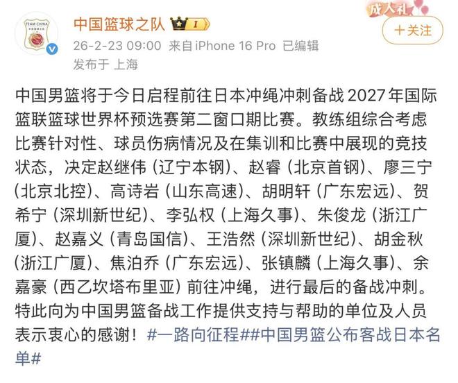 23日,中国男篮的官方微博宣布,国家队教练组综合考虑比赛针对性、球员伤病情况及在集训和比赛中展现的竞技状态,决定赵继伟(辽宁本钢)、赵睿(北京首钢)、廖三宁(北京北控)、高诗岩(山东高速)、胡明轩(广东宏远)、贺希宁(深圳新世纪)、李弘权(上海久事)、朱俊龙(浙江广厦)、赵嘉义(青岛国信)、王浩然(深圳新世纪)、胡金秋(浙江广厦)、焦泊乔(广东宏远)、张镇麟(上海久事)、余嘉豪(西乙坎塔布里亚)等球员前往冲绳,进行最后的备战。