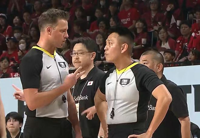 比如,下半场比赛,贺希宁一次进攻,几乎是没有什么附加动作,却吹了他一个进攻犯规。反观,日本队球员西田优大对赵继伟进行一个凶狠上脚动作,很明显是违体犯规!面对这样的情况,中国男篮主教练郭士强,也是向裁判进行投拆,出乎意料的是,裁判看了录像回放之后,并没有给西田优大违体犯规,反而是给了郭士强一个技术犯规……